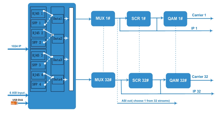 * Acceptă 16 (sau 32) de TS multiplexate prin ieșire UDP/RTP/RTSP