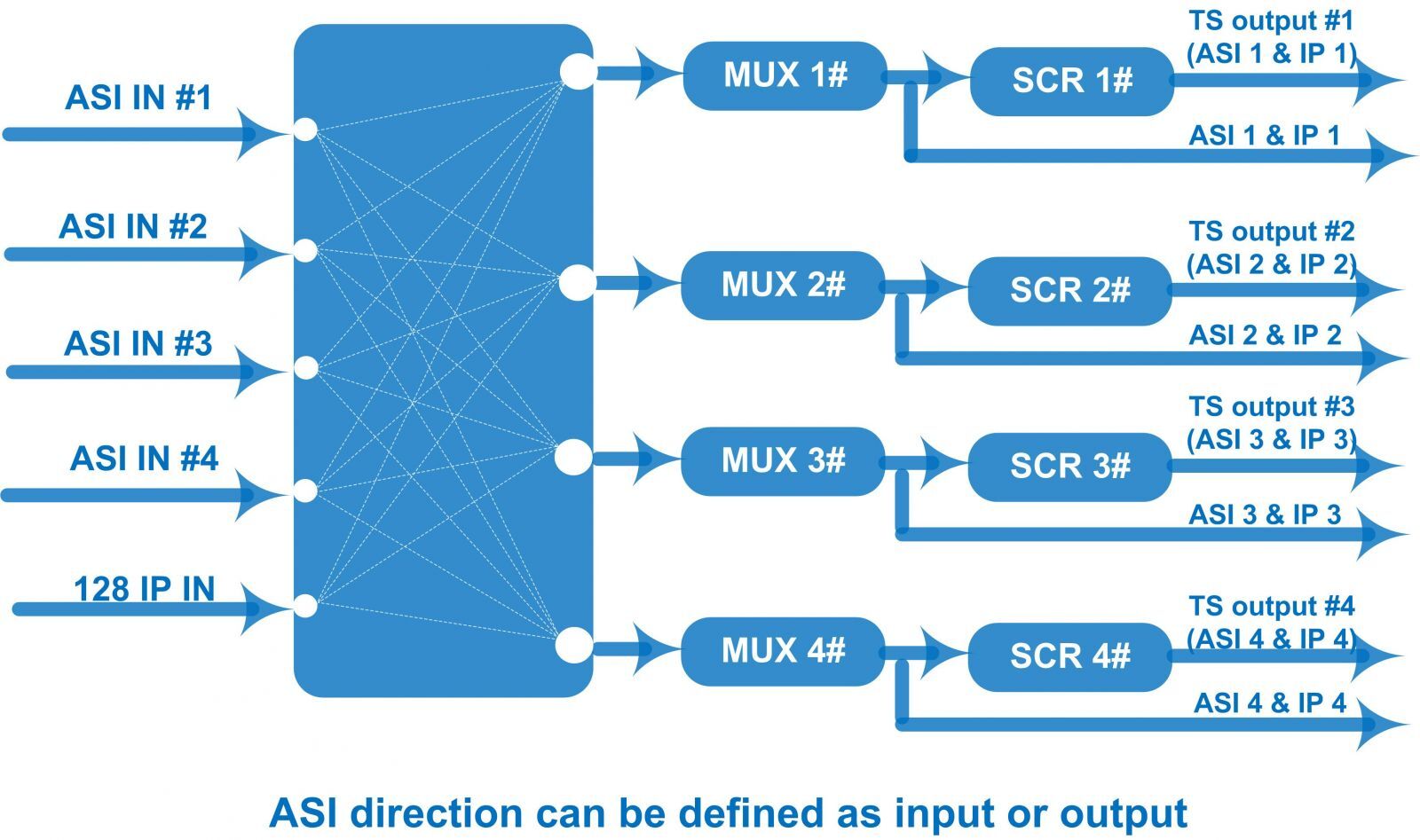 * Intrare/ieșire IP: 128 intrări IP, 4 ieșiri IP (MPTS) prin 3 porturi de date bidirecționale