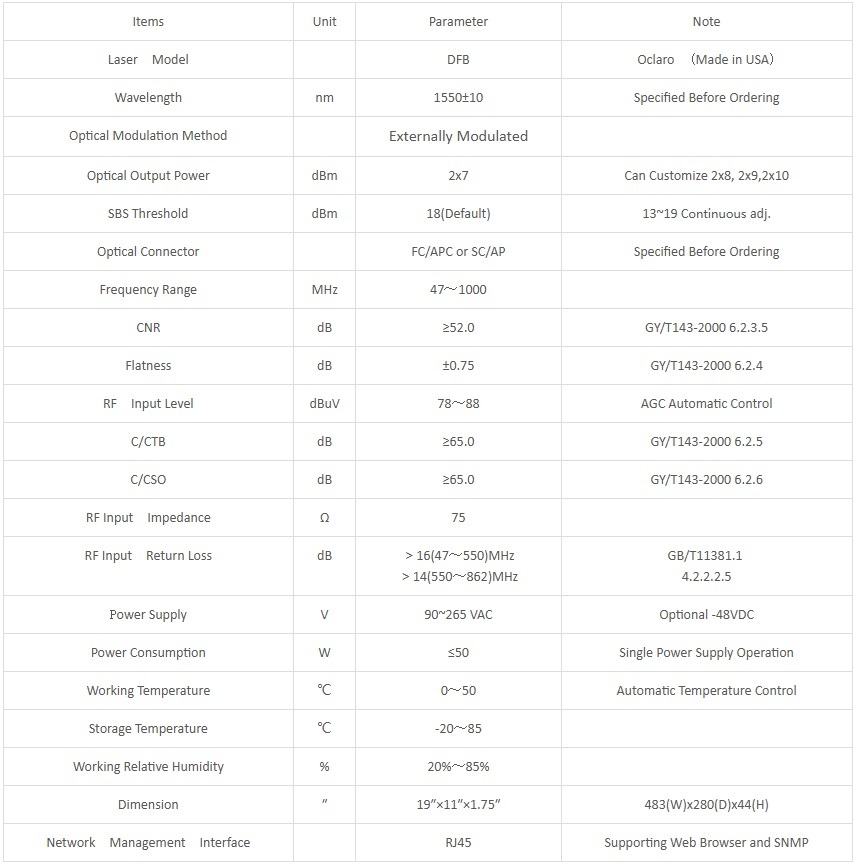 ◆ Flexibilitate: Tehnologia de modulație de fază a modulatorului extern maximizează puterea optică a fibrei pentru a obține transmisii pe distanțe lungi, asigurând în același timp performanța CSO excelentă a sistemului, iar pragul SBS este reglabil continuu: 13-19 dBm; modul AGC / MGC selectabil la fața locului, OMI poate fi reglabil, potrivit pentru diferite transmisii în rețea.