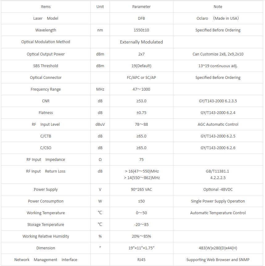 ◆ Flexibilitate: Tehnologia de modulație de fază a modulatorului extern maximizează puterea optică a fibrei pentru a obține transmisie pe distanțe lungi, asigurând în același timp performanța CSO excelentă a sistemului, iar pragul SBS este reglabil continuu: 13-19 dBm; Modul AGC / MGC selectabil la fața locului, OMI poate fi reglabil, potrivit pentru diferite transmisii de rețea.