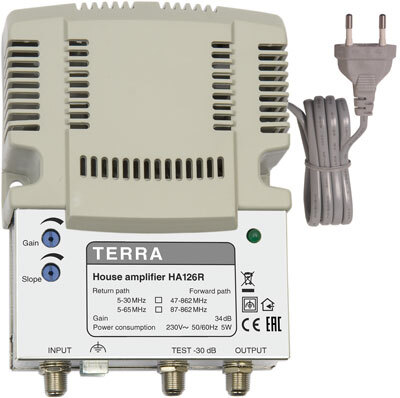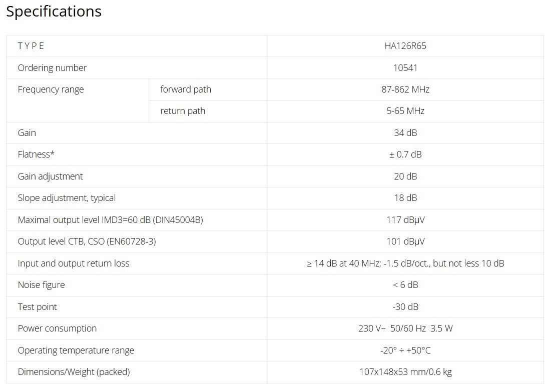 Amplificator CATV și radio FM cu 2 ieșiri. Reglare a câștigului și pantă fixă de 4dB. Amplificatorul este destinat utilizării în interior. Are tehnologie push-pull.