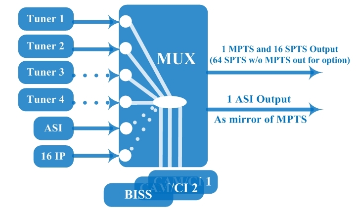 * 1 intrare ASI și 16 intrări IP (UDP/RTP) pentru re-mux